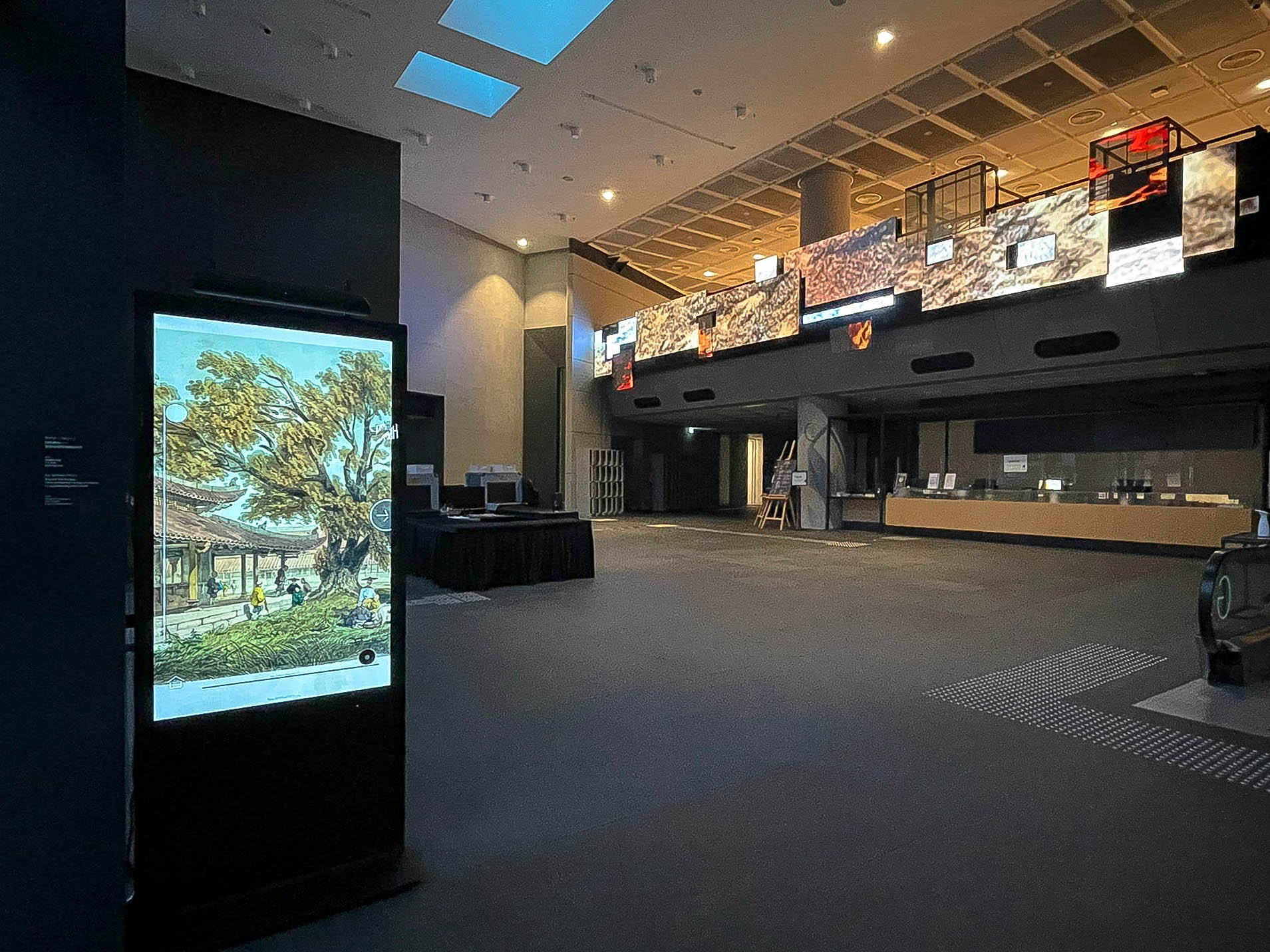 In celebration of the 60th anniversary of the HKMoA, Ng Tsz Kwan is commissioned to create a multisensory and site-specific experiential installation “Beyond the frames – from perceiving frames of context to experiencing art in itself” to be displayed to embody the visual storyline transformed from the museum’s four core collections. It attempts to break the audiences’ predetermined ways of art appreciation, enables them to focus on and explore more about the artworks. Audience can interact with the installation by choosing images of collection highlights preset in the kiosk to create a new visual storyline. At the time when an artwork is selected, the 16m-long group of LED displays in different sizes and formats above the Concierge synchronize to show that specific piece at an enormous scale. The installation provokes the viewers into reflecting on how they see and understand art from the varying frames of different underlying contexts. Such spectacular on-the-spot impact gives the audience a brand new museum experience with their unique interpretation.
